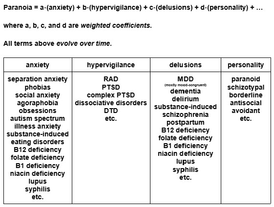When we consider paranoia, many clinicians jump to the fifth row of the third column (i.e. schizophrenia). But what about all the other contributors to what patients call paranoia? Clinicians don’t use a uniform definition of paranoia either. In any case, paranoia is a complex and highly multifactorial phenomenon, so I wrote the pictured equation to help keep us thorough, comprehensive and protective for our patients.